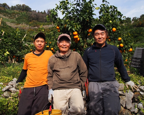 左から実習生のテエ君、宇都宮利治さん、後継者の宏生さん。