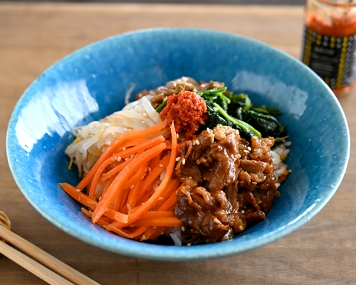 焼いた牛肉、ナムルといっしょにレモンこしょうをご飯にのせて、簡単ビビンバ。