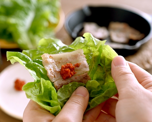 豚肉ともよくあう。サンチュでまいて、サムギョプサル風に。