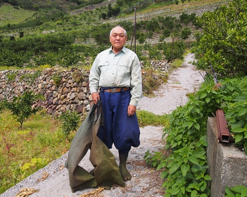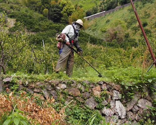 「草を刈っても2週間後にはもう伸びちょるけん、園地ごとの作業が間に合わん!」と言いながら、機敏に段々畑を登っていく姿はさすが玄人。草刈作業はかなりの重労働ですが、雑草との勝負はこれからもまだまだ続きます。