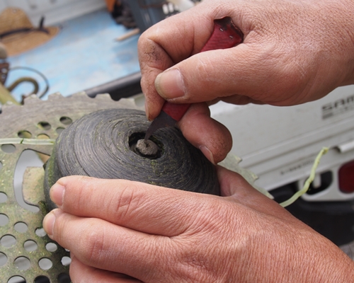 草刈機に草の筋が絡まってしまって動かない、テグスが切れた!そんな時に活躍するのが小さな鉄ノコ。草刈機のプラスドライバーを入れる溝の掃除にも使える優れモノ。「親父に作り方から活用法まで習った」という敬雄さん。小さな道具一つにも、代々受け継がれる知恵とひらめきが光ります。