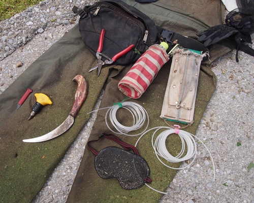 大津敬雄さんが草刈作業時に身に着けているショルダーバッグの中身を見せてもらいました。左から①手作り道具、②プラスドライバー③剪定ノコギリ。剪定ノコギリの右斜め上が④芽切りハサミ、⑤水筒入れ。水筒入れが⑥手作り道具入れで、下が⑦テグス(2種類)。テグスの下が⑧アミメガネです。