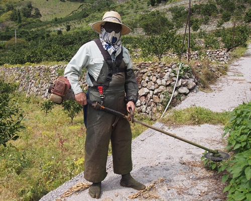 安全性、敏捷性、利便性など道具選びの基準は様々ありますが、敬雄さんは「やっぱりグツ(使い勝手)がいいやつよ」と即答。草刈機については「機械類は使わんと分からん。なんぼ値段が高くても気に入らんのもあるけん難しいんよ」とのこと。敬雄さんは同じものを3本持っており、長年愛用しています。草刈機を使った作業は、長時間の作業による振動で手や腕に大きな負担がかかることに加え、刈った草や小石がものすごい速さで飛んでくることもあり、危険が伴うので草刈用の装備が必要になります。