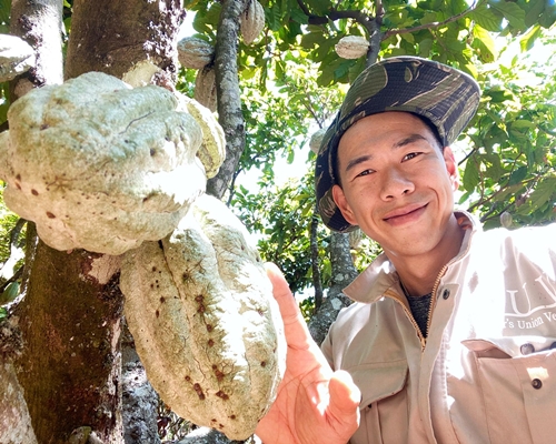 私はこの数年ベトナムで仕事をするうちにカカオの魅力に取り憑かれてしまいました。苗を植え本格的な収穫ができるまで9年と長く、栽培が難しい事に魅力があり、また世界中の人がチョコレートやココアを愛しているのに、その原料となるカカオ豆がどの様にできているかを知る人が少ないことも面白味のひとつです。
