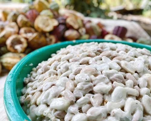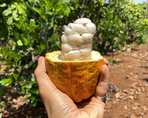 カカオの果実はカカオポッドと呼ばれ、ラグビーボールの様な形をしています。中には甘酸っぱい果肉が詰まっており、果肉の中に鮮やかな紫色の種があります。この種を木箱に詰め発酵させ、乾燥させたものが「カカオ豆」と呼ばれるものです。実はこの発酵が極めて重要で、発酵させないとチョコレートやココアの風味は生まれません。この為カカオ豆を生産するには、栽培・発酵・乾燥等の技術が必要となり、ベトナムでは新たにカカオを植える人は減少傾向にあります。