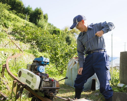 世に出てから50年以上が経ったモノラック。明浜では取って代わるような運搬手段はいまだに登場していません。最近は農家の栽培面積が大きくなり、農道に加えて園内道を作るケースも出てきましたが、道を作れる場所は限られています。急傾斜に耐えるだけではなく、畑の姿を大きく変えなくて良いのも優れているところ。まだまだモノラックに頼るみかん栽培が続きます。