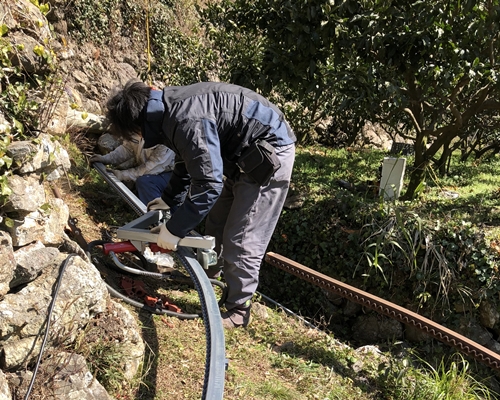 みかん農家が自分でレールを敷設するのは難しく、地域では農機具屋さんが設置工事を担っています。モノラックの設置ルートは直線ではなく、石垣や傾斜を考慮してカーブを付けることは珍しくありません。設置工事の際は一本6mのまっすぐなレールを運び込み、その場で上下左右の角度を調整しながらレールを曲げます。こうして複雑な地形に沿ってレールを繋いでいきます。