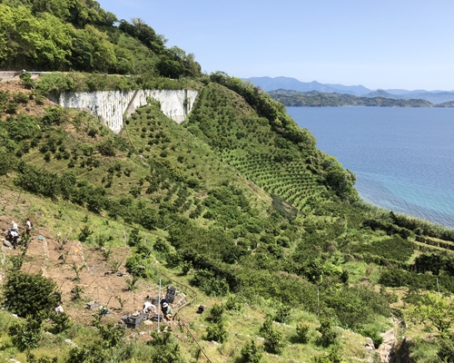 段々畑の石垣を修繕するワークショップ“石積み学校”を開催しました。無茶々園のある明浜では段々畑が発達しており、ほとんどがみかん畑として利用されています。山の斜面を階段状にすることで平坦な面を作り、農産物を栽培しやすくなるように整地したのが段々畑です。傾斜が強く雨量も多い当地では、土で固めるだけでなく法面に石垣を積んで崩れにくい段々畑を築いてきました。