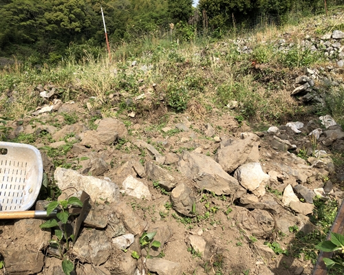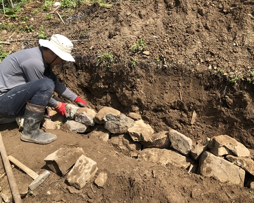 石積みは斜面の土を掘ることからはじまります。石を積み上げたい位置、石垣のラインを頭に描き、その少し奥までツルハシで削るように掘り下げていきます。石垣の基礎になるところは奥に向けて傾斜をつけながらしっかりと掘り込みます。そして積み上げていくための石を準備します。石にも2種類あり、表面に並べていく“積み石”のほかに、“ぐり石”と呼ばれる砂利からこぶし大くらいの石が大量に必要になります。この積みはじめるまでの準備が大切で、石積みの際にもっとも時間がかかる工程です。