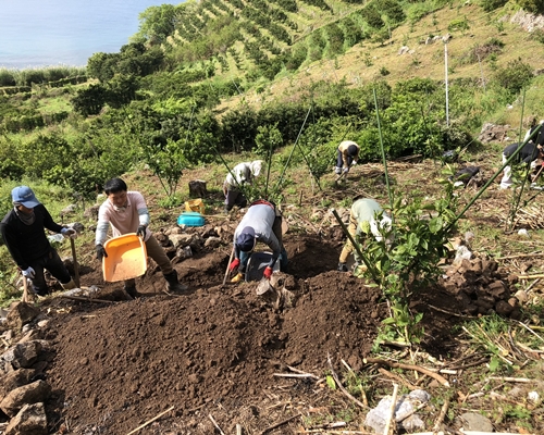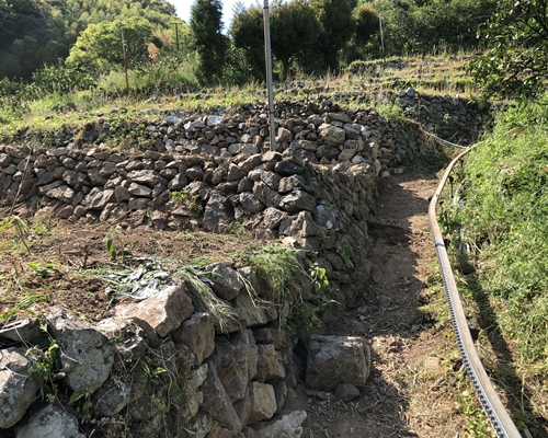 一世紀以上前に築かれた石垣の上に成り立っている現代のみかん作りですが、せっかくの石積みも時間が経つにつれて徐々に崩れるところも出てきます。経年劣化や水害だけでなく、最近はイノシシによる被害が激しくなりました。草の根や小動物を食べるために畑の土を掘り返し、そのまま石垣をめちゃくちゃに崩してしまうのです。いま、修繕には時間がかかるうえ、積み直す方法もわからず、結果として崩れたままになっている石垣が増えています。昔を知る年寄りには石積みの経験があって少しずつ修繕の技術が伝わってきましたが、最近ではしっかり石積みを学ぶ機会も失われていました。